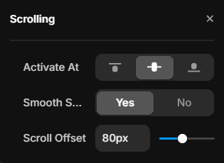 You can choose the position on the page that activates the section switch, toggle between smooth and regular scroll and set the scroll offset.
